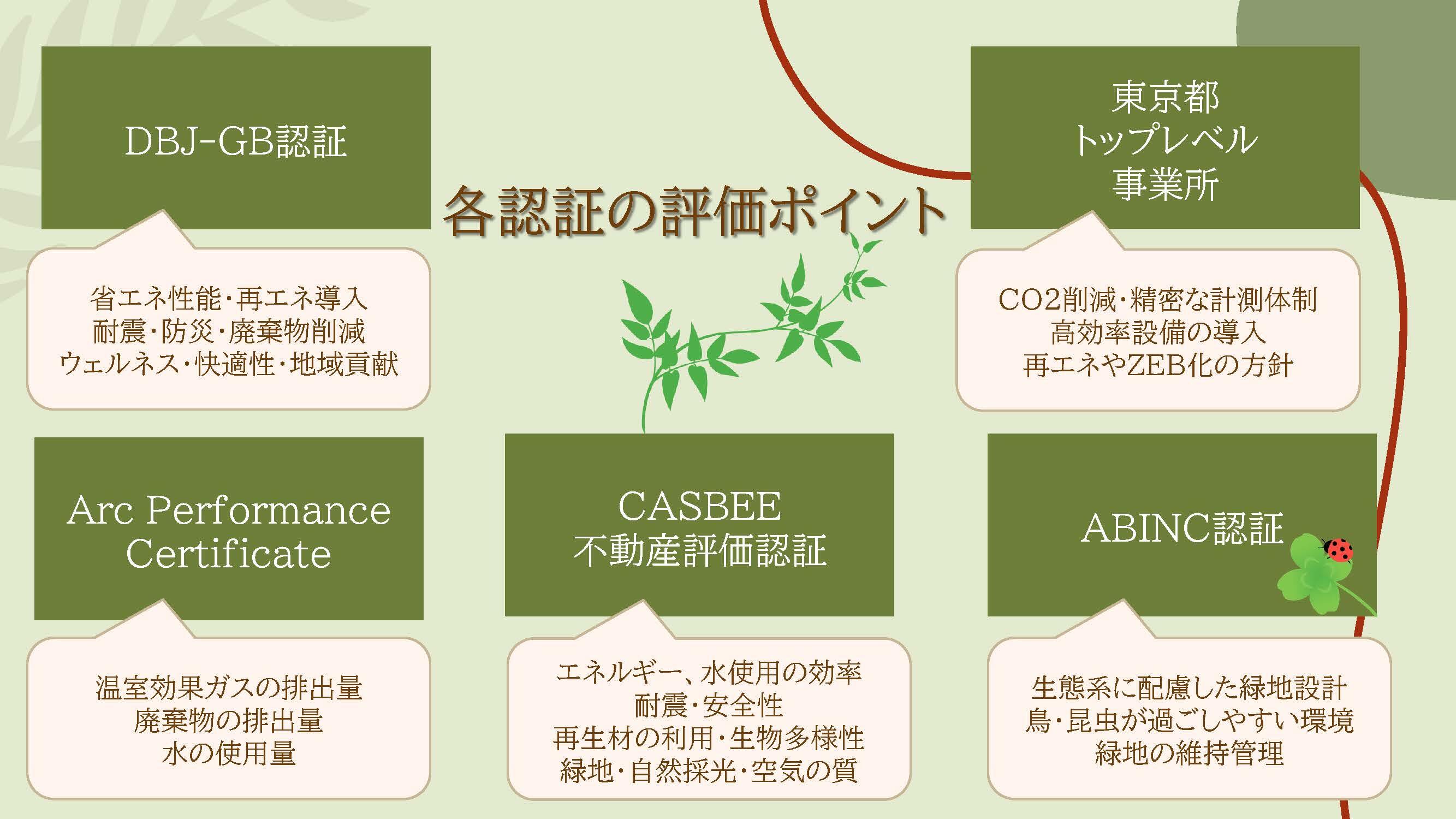 環境認証とは、企業が行う環境配慮に対する取り組みを第三者機関が客観的に評価し、認証する仕組みです。省エネや空気の質、緑地のあり方、防災性など、建物の"性能"と"取り組み"を多角的にチェックし、その建物の価値をわかりやすく示してくれます。