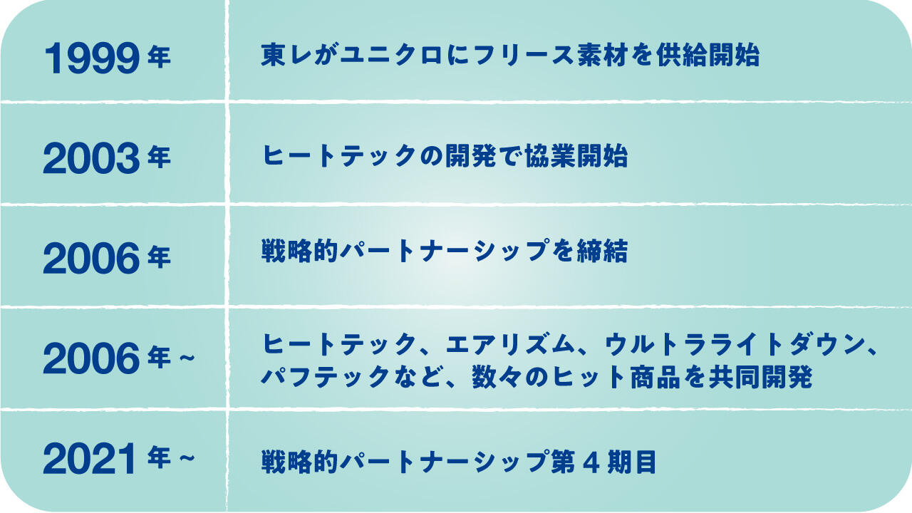 ユニクロと東レは、1999年のフリースの素材供給を皮切りに、2003年にヒートテックの開発で協業を開始。