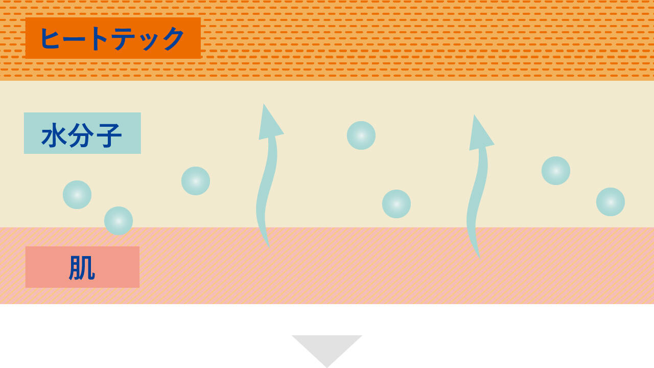 「薄くて軽いのに暖かい」ヒートテックの秘密は、4種類の繊維それぞれの特性を組み合わせたことにあります。 レーヨンが体から常時発散される水分をキャッチし、その運動エネルギーを熱に変換。