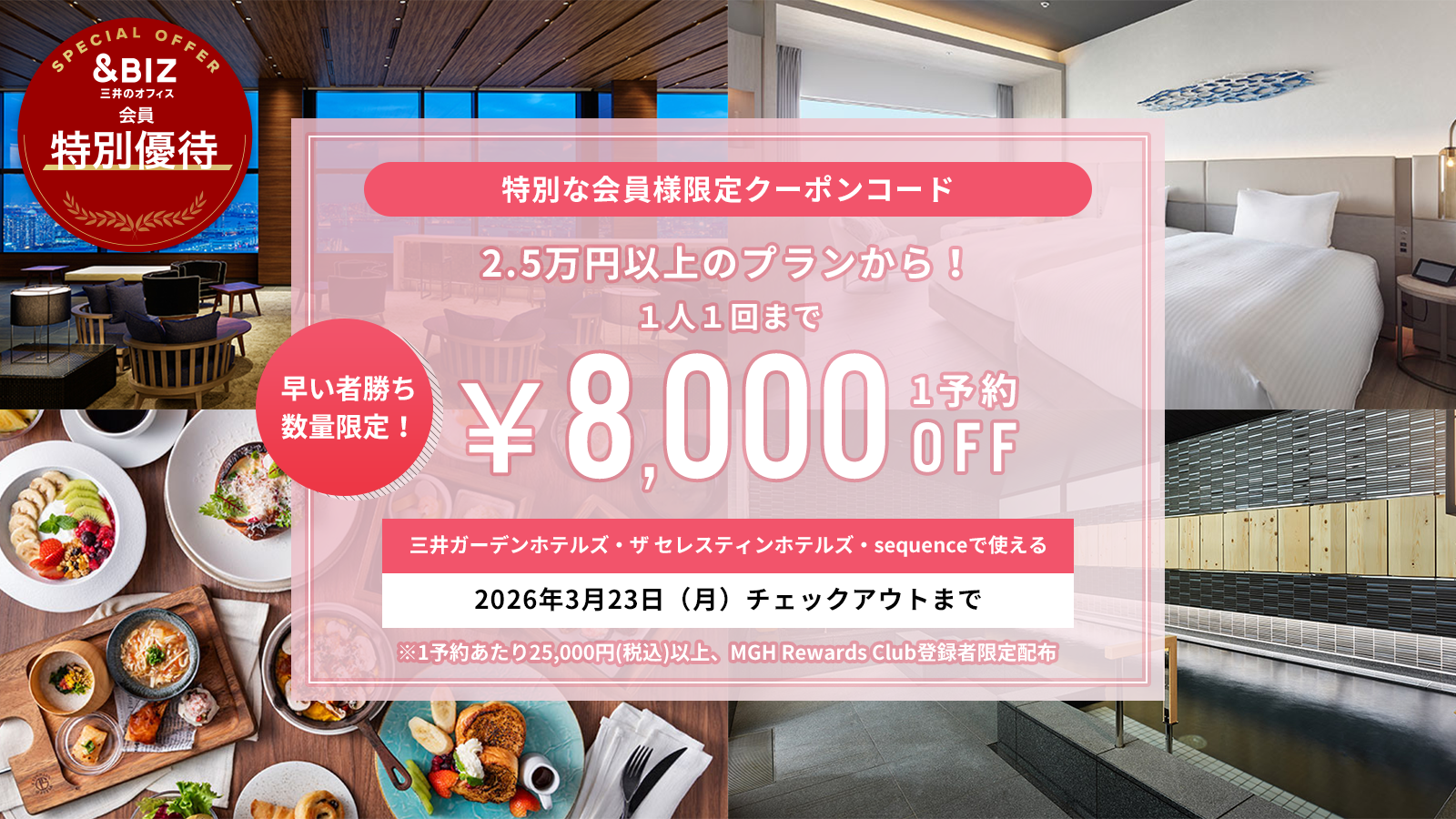 三井不動産のホテル・リゾート法人優待サイト「31corp]より、数量限定で“全国すべての三井ガーデンホテルズ、ザ セレスティンホテルズ、sequenceでお使いいただける”「8,000円OFFクーポン」をご用意しました!&BIZ会員の皆様のご宿泊をお待ちしております。