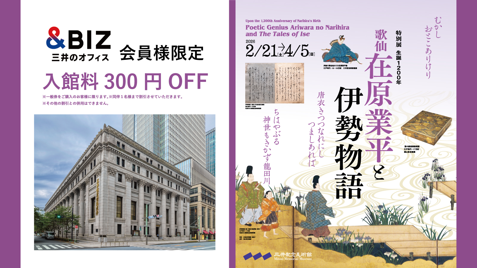 &BIZ会員様限定で、三井記念美術館で開催中の開館20周年特別展「生誕1200年 歌仙 在原業平と伊勢物語」の入館料を、300円引きいたします!
