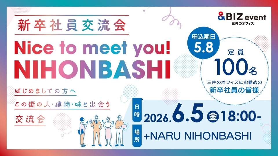 | 内容 | 新卒社員交流会 ~Nice to meet you NIHONBASHI |